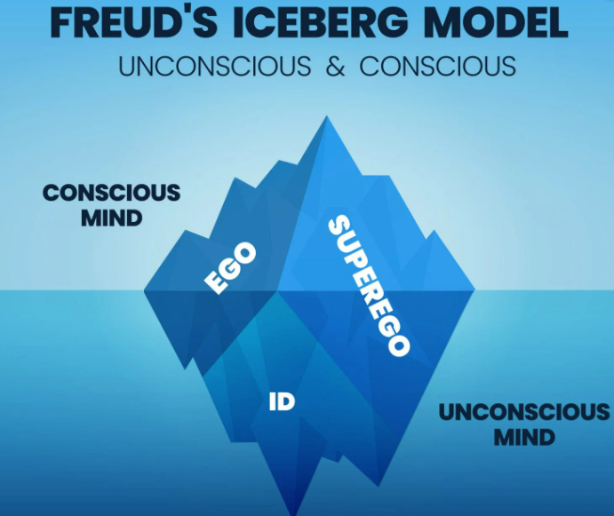 프로이드는 이야기치료와 자유연상법을 통하여 심리적 의식에는 세 가지 수준이 있다고 했으며 의식의 수준을 설명하기 위해 빙산의 이미지를 사용하였습니다.